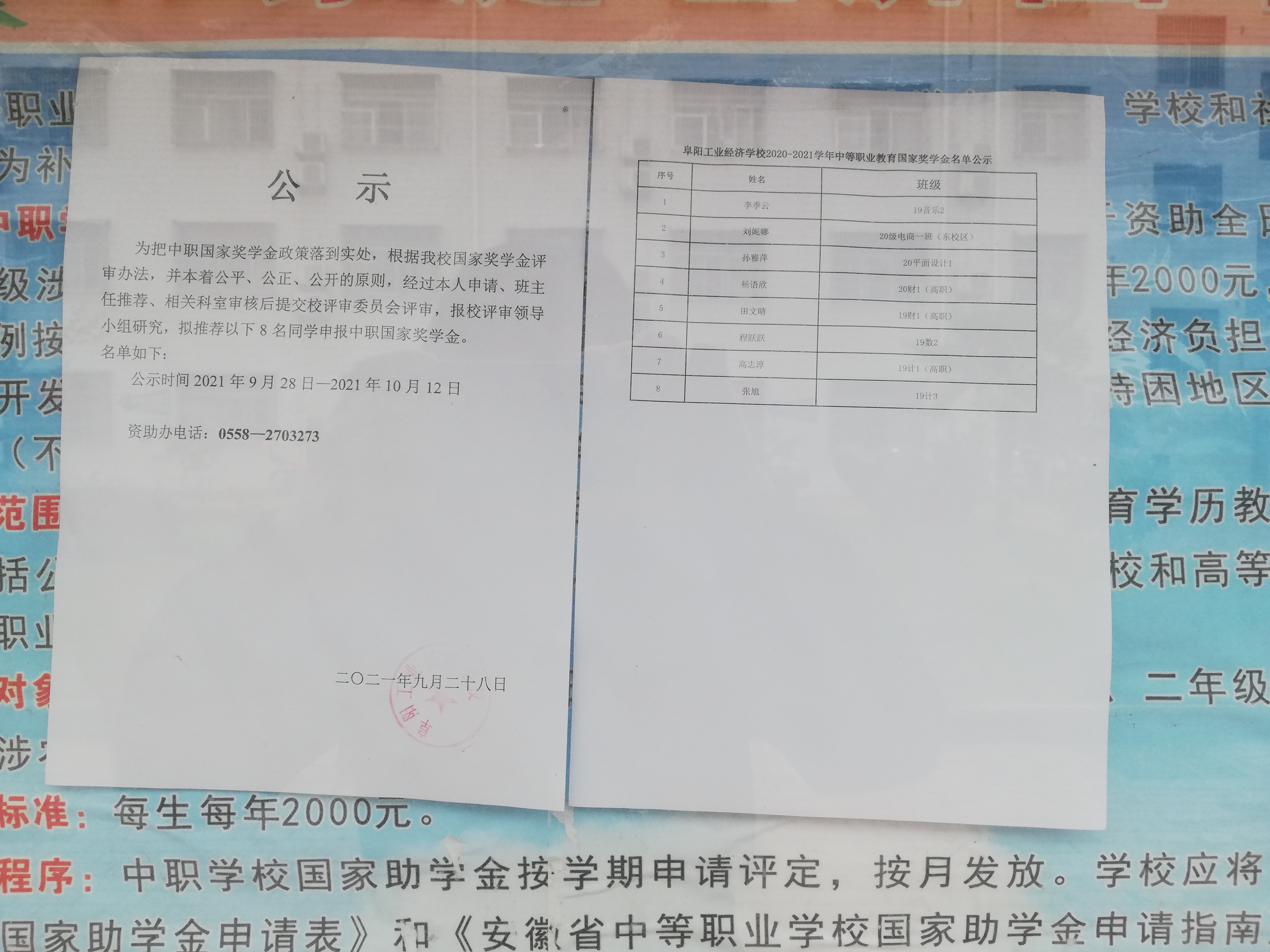 阜阳工业经济学校2020-2021学年中等职业教育国家奖学金名单公示