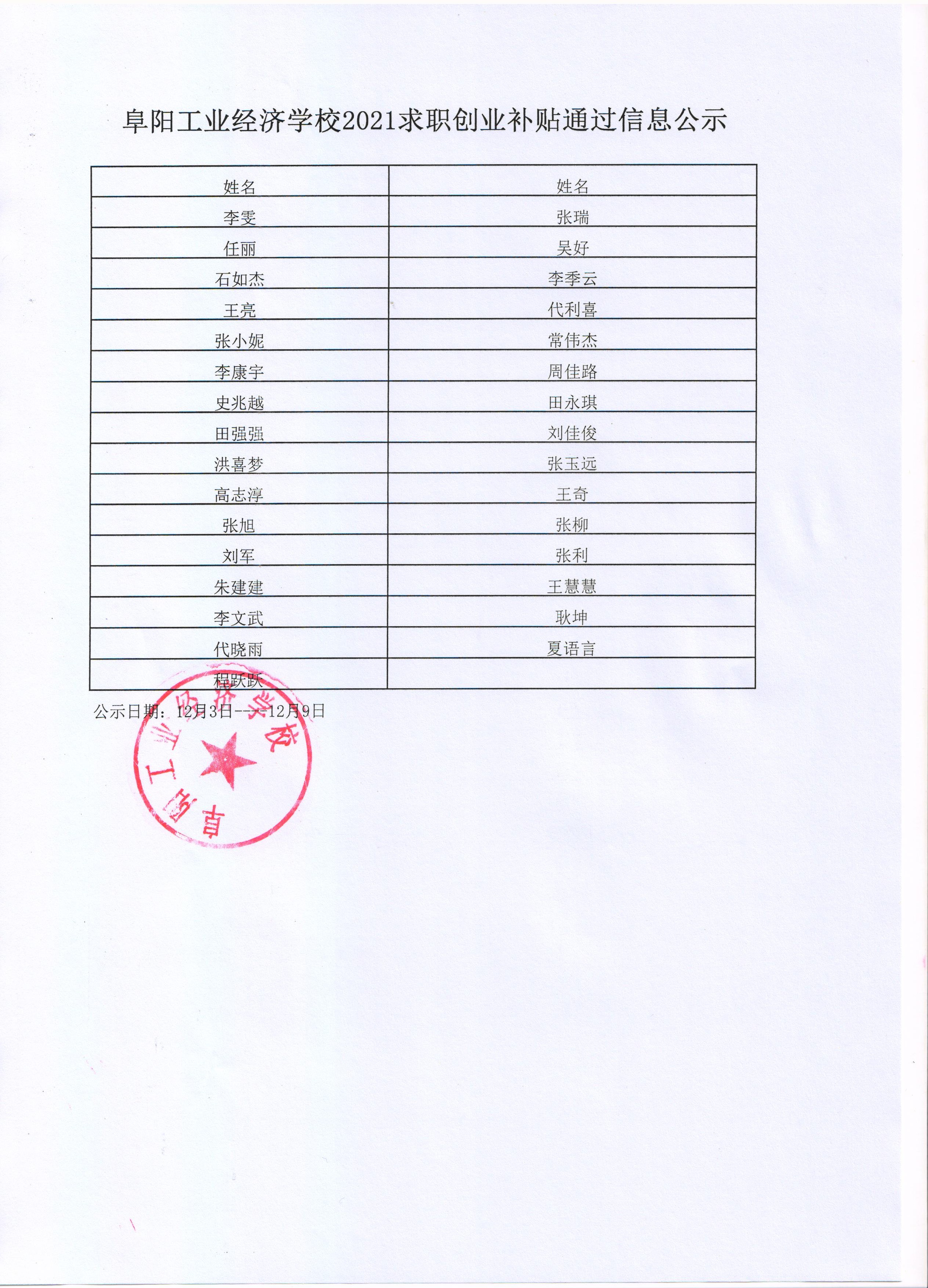阜阳工业经济学校2021求职创业补贴通过信息公示