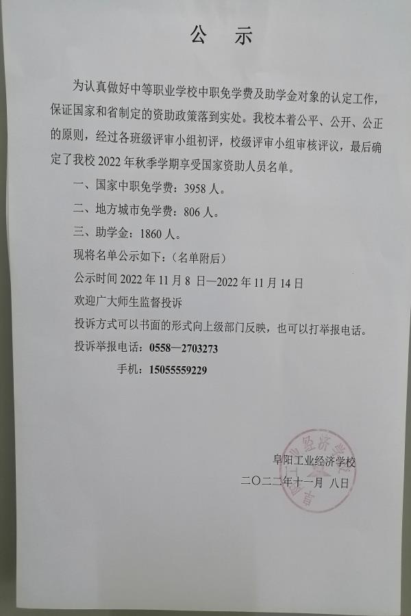 阜阳工业经济学校 2022年秋季学期资助、免学费公示