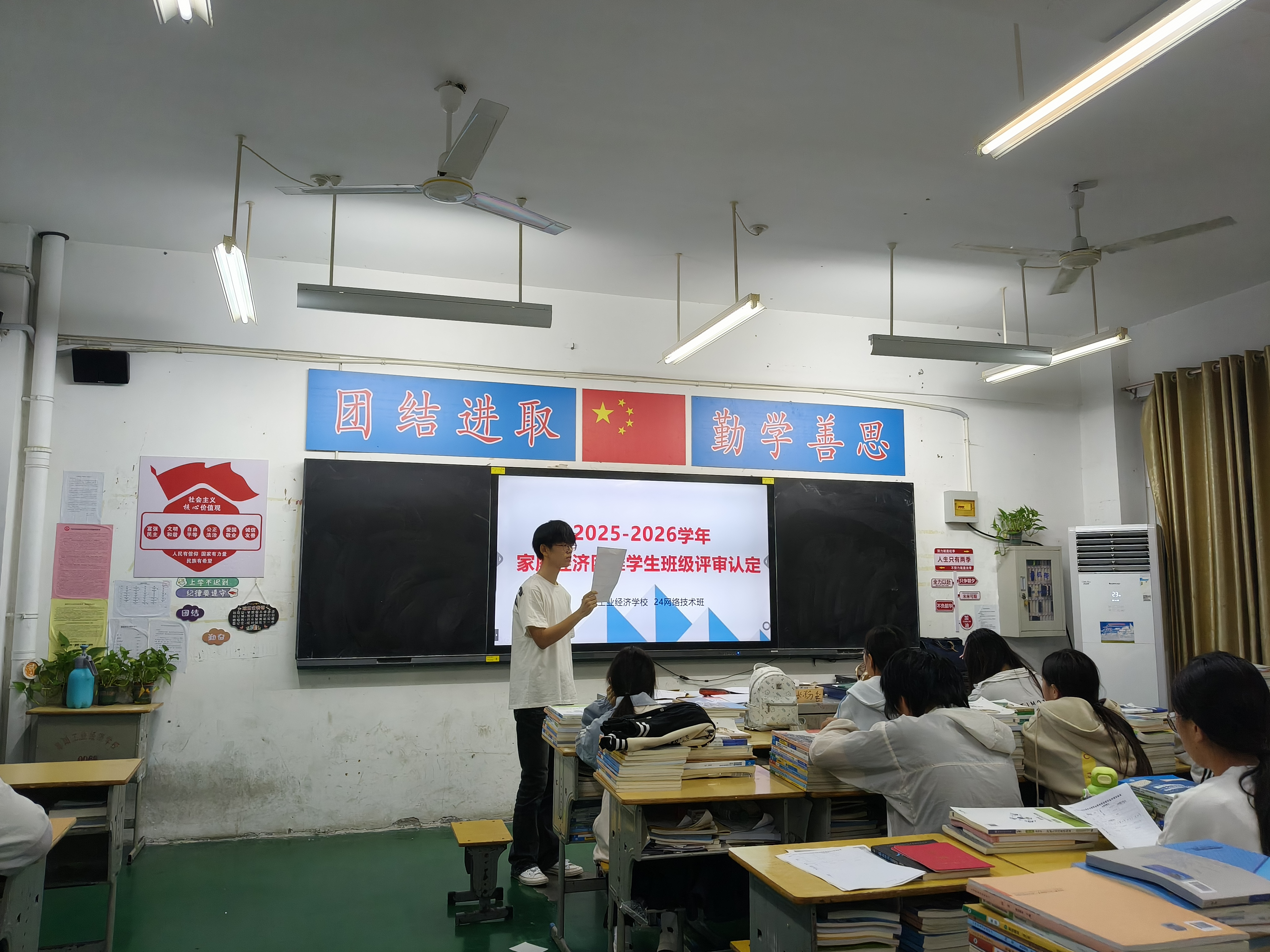 阜阳工业经济学校2025年秋季学期根据皖财教[2024]1252号文件、阜财教[2025]42号文件通知要求正式启动家庭经济困难学生班级评审认定工作。各班级按照校资助办公室工作要求利用晚自习时间召开国家助学金家庭经济困难学生评审认定会,班主任系统地讲解了国家助学金的认定办法、申请条件、标准、评审、申报流程及相关表格填写注意事项。